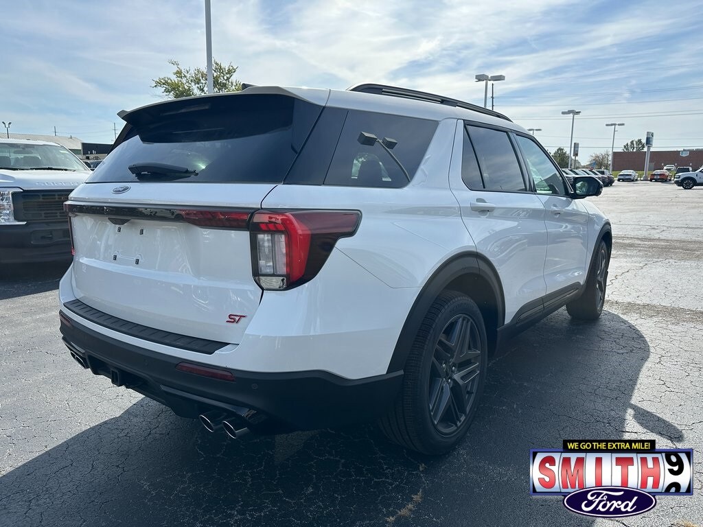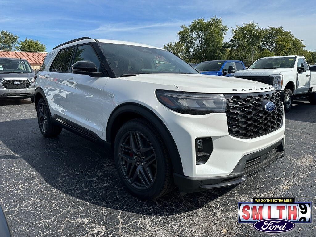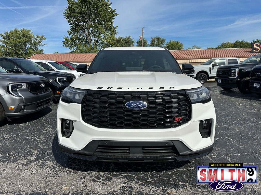 2025 Ford Explorer ST 4D Sport Utility Star White Metallic Tri-Coat 4WD 10-Speed Automatic 3.0L EcoBoost V6 B&O Sound System by Bang & Olufsen, Heated steering wheel, Heated/Ventilated Miko Sport Captain's Chairs, Multicontour Seats w/Front Active Motion, Panoramic Vista Roof w/Power Shade, Sun and Sound Package.